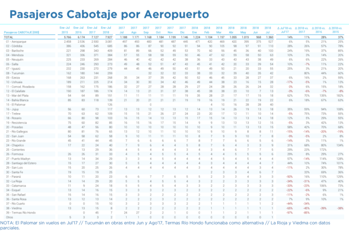 Analizando las principales variaciones por aeropuerto contra julio 2017, en pasajeros de cabotaje hubo un incremento del 62% para Mar del Plata (35.500pasajeros); 58% para Posadas (30.200 pasajeros); 57% para Puerto Madryn (8.500 pasajeros); 44% para Santiago del Estero (14.100 pasajeros) y 35% Jujuy (35.300 pasajeros).