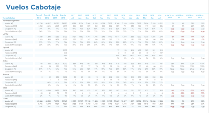 Pero AR logró julio vs julio con un 1% más vuelos tuvo un empate técnico en pasajeros, en el año acumula un 4% más de vuelos y pasajeros y desde 2015 creció un 30% en pasajeros y un 26% en vuelos