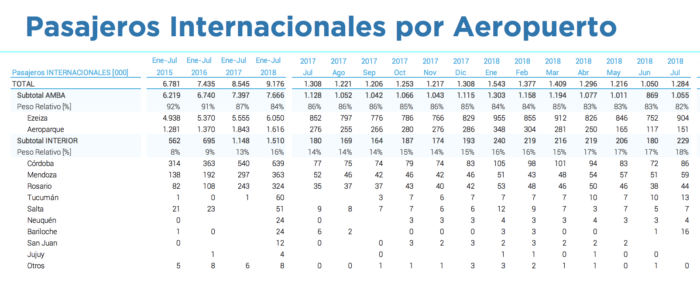 Adicionalmente, continúa creciendo el número de pasajeros que conectan entre ciudades del interior sin pasar por Buenos Aires. Por ejemplo, la conexión Bariloche – Rosario tuvo un incremento del 290%; Córdoba – Bariloche, 107%; Córdoba – Iguazú, del 86% y Mendoza – Rosario, del 73%, entre otras (todas en ambos sentidos); así como nuevas rutas como Mendoza – Comodoro Rivadavia, con más de 4.000 pasajeros en el mes. A la vez, se siguen reforzando conexiones que utilizan al aeropuerto de El Palomar, por el cual transitaron 80 mil pasajeros en julio, lo que lo coloca en el 9no lugar en término del número de pasajeros de cabotaje. Desde él se inauguraron en julio las rutas hacia Puerto Iguazú y Santiago del Estero, con 8.900 y 3.400 pasajeros volados, respectivamente.En el plano internacional, el total de pasajeros se contrajo un 2% contra julio del 2017. Sin embargo, el acumulado anual se mantiene en +7% al comparar contra el período enero – julio 2017, pasando de 8,55 a 9,18 millones de pasajeros, respectivamente. Si se tienen en cuenta los vuelos que conectan con el interior del país, el crecimiento es del 31% en el año, con 1,51 millones de personas contra 1,15 millones que volaron en los primeros siete meses del 2017. Se destaca el caso de Bariloche, donde más de 16.000 pasajeros pasaron a través de él en vuelos internacionales, siendo el crecimiento del 162%: más de 11 mil lo hicieron en la conexión con San Pablo y 4 mil, con Campinas. Actualmente, las rutas más utilizadas son las que unen las ciudades de Córdoba y Mendoza con Santiago de Chile: con 36 y 27 mil pasajeros, respectivamente, escoltadas por Córdoba – Panamá (15 mil pasajeros). En julio se incorporó la ruta Córdoba – Porto Alegre, utilizada por más de 3.000 mil pasajeros. Destacable también es que Mendoza y Tucumán tuvieron récord histórico de pasajeros internacionales arribados a dichas terminales en el mes de julio.