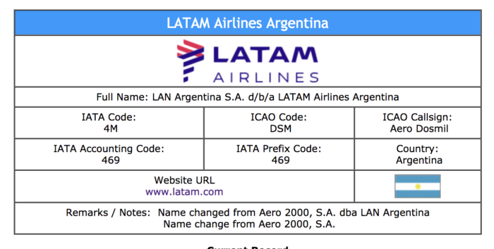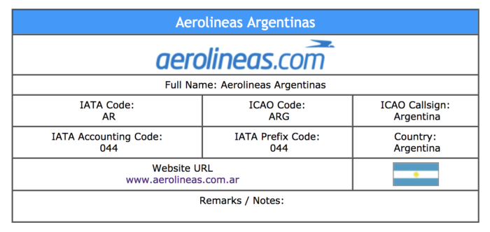 También ahí vemos que el IATA es AR… no AA 😛 que es de American Airlines. Luego está el ICAO que estimo se usa también en varios lados, como el número de cuenta de IATA que se debería ver el el número de los pasajes emitidos al comienzo.