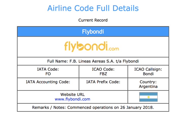 4M dicen Lanar, A0 dicen Avianca además de Avian, OY dicen Andes, y FB notifican de las dos formas: Flybondi o simplemente Bondi.