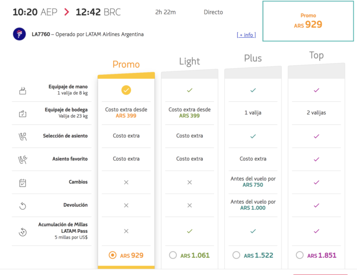 La promo y la light no incluyen equipaje ni selección de asiento. La diferencia entre las dos es que una suma millas y la otra no. Pero la valija cuesta $399 en ambos casos. La tarifa PLUS que cuesta $593 más que la PROMO y $461 más que la LIGHT la incluye. O sea que dejemos de lado la PROMO, si iban por la light les conviene la PLUS porque por $62 tienen la posibilidad de elegir el asiento, pero también la chance de cambio o devolución…