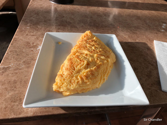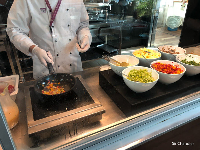 Hay puestos de comida donde uno se sirve muchas cosas o también hay otros donde uno puede pedir algo preparado. Como era la mañana se podían pedir huevos o un omelette