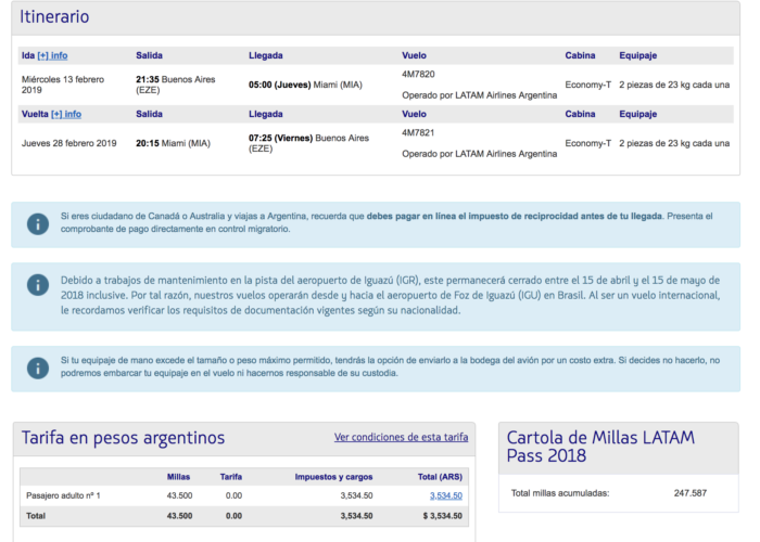 Y si bien no tiene que ver con la promo, porque no está en los meses promocionados, quiero destacar que para febrero se puede encontrar el canje a Miami en el vuelo directo de Latam Argentina por el valor base 43.500, algo que no recuerdo haya sucedido nunca… o si había era con el tramo de ida. Es algo también para aprovechar quien tenga la posibilidad de hacerlo