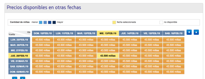 A mí lo que me pasa es que tengo justo 60.000 millas, así que para pasar al paso 3 me dice que no tengo las 87500 millas necesarias para 2 personas! 🙁 Igual si hago la simulación con 1 solo pasajero, tampoco me propone nunca las 30000 millas, siempre 36000