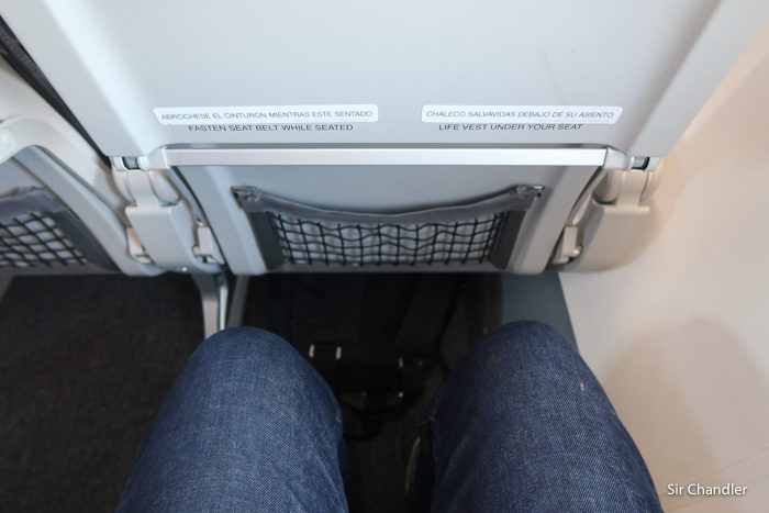 Son 189 asientos y esta es la distancia en un asiento común (no salida de emergencia). Obviamente estas pruebas son hechas con la espalda bien pegada (técnicamente se dice el culo bien pá atrás, pero es fuerte). Y con el correr del tiempo uno se va desplazando. Pero lo que si puedo decir es que estuve en varias filas y siempre fue la misma distancia… cosa que no me pasó en otras empresas que quizás recibieron aviones reconfigurados entonces puede haber diferencias. Estos son así de fábrica