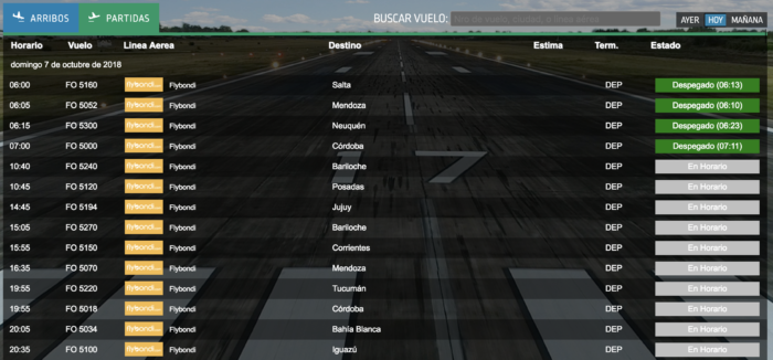A las 7 de la mañana de hoy hizo en vuelo regular El Palomar Córdoba, regresará y saldrá hacia Bariloche ida y vuelta y Mendoza posteriormente, según lo que se puede ver en la programación cargada internamente.