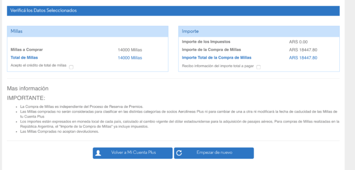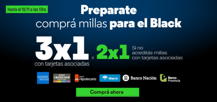 TÉRMINOS Y CONDICIONES: PARA OBTENER EL “BONO DE MILLAS EXTRAS”, LOS SOCIOS AEROLÍNEAS PLUS DEBEN COMPRAR POR LO MENOS 1.000 HASTA 65.000 MILLAS EN UNA SOLA TRANSACCIÓN DESDE LAS 13HS DEL 12/11/18 HASTA LAS 13HS DEL 19/11/18 INCLUSIVE. PARA ACCEDER AL “BONO DE MILLAS EXTRAS” INDICADAS PARA SOCIOS CON BANCOS ASOCIADOS, ADEMÁS DE ESTAS CONDICIONES, LOS SOCIOS DEBERÁN TENER ASOCIADAS A SU CUENTA UNA TARJETA DE CRÉDITO AEROLÍNEAS PLUS EMITIDA POR CUALQUIERA DE LAS ENTIDADES BANCARIAS Y/O FINANCIERAS EN ASOCIACIÓN VIGENTE CON PROGRAMA AEROLÍNEAS PLUS. LAS MILLAS EXTRAS DE BONIFICACIÓN OBTENIDAS CORRESPONDEN A UN 100% (CIEN PORCIENTO) ADICIONAL A LAS COMPRADAS, Y EN CASO QUE EL SOCIO TENGA ASOCIADA A SU CUENTA UNA TARJETA DE CRÉDITO AEROLÍNEAS PLUS EMITIDA POR CUALQUIERA DE LAS ENTIDADES BANCARIAS Y/O FINANCIERAS EN ASOCIACIÓN VIGENTE CON EL PROGRAMA AEROLÍNEAS PLUS, EL “BONO DE MILLAS EXTRAS” CORRESPONDERÁ A UN 200% (DOSCIENTO PORCIENTO) DE LAS MILLAS COMPRADAS EN LA TRANSACCIÓN. LAS MILLAS COMPRADAS COMO EL “BONO DE MILLAS EXTRAS” SE ACREDITARÁN A LA CUENTA DEL SOCIO EMISOR DE LA COMPRA. LAS MILLAS DE BONIFICACIÓN OBTENIDAS NO CUENTAN DENTRO DEL LÍMITE MÁXIMO ANUAL PERMITIDO DE COMPRA DE MILLAS. LA COMPRA DE MILLAS SOLO PODRÁ REALIZARSE EN AEROLINEAS.COM (SITE ARGENTINA), SOLO PARA SOCIOS AEROLÍNEAS PLUS MAYORES DE 18 AÑOS Y RESIDENTES EN ARGENTINA CON LAS TARJETAS DE CRÉDITO QUE FUEREN ACEPTABLES AL MOMENTO DE LA ADQUISICIÓN, Y SU VALOR SERÁ CALCULADO AL CAMBIO VIGENTE DEL DÓLAR ESTADOUNIDENSE PARA LA ADQUISICIÓN DE PASAJES AÉREOS, MÁS EL 21% DE IVA, CONSTITUYENDO EL PRECIO FINAL. LA BASE DE COMPRA SERÁ 1.000 MILLAS = U$S 30, SIENDO ÉSTE EL NÚMERO MÍNIMO DE MILLAS QUE SE PODRÁN COMPRAR. SOLO SE VENDERÁN EN MÚLTIPLOS DE 1.000 MILLAS HASTA UN MÁXIMO DE 120.000 POR AÑO CALENDARIO. UNA VEZ ACREDITADAS LAS MILLAS EN LA CUENTA NO SE ADMITIRÁN CAMBIOS NI DEVOLUCIONES. LAS MILLAS PODRÁN ADQUIRIRSE PARA SER APLICADAS A UN PREMIO O BIEN, PARA SER ACUMULADAS EN LA CUENTA DEL ADQUIRENTE PARA SER APLICADAS A FUTUROS BENEFICIOS DEL PROGRAMA. LA COMPRA DE MILLAS ES INDEPENDIENTE DEL PROCESO DE RESERVA DE UN PREMIO. LA RESERVA DE UN BILLETE DE PREMIO SE ENCUENTRA SUJETA A LA DISPONIBILIDAD DE PLAZAS EN EL VUELO Y LA RUTA ELEGIDAS POR EL SOCIO EN EL PROCESO DE RESERVA. LOS PREMIOS EMITIDOS CON MILLAS COMPRADAS ESTARÁN SUJETOS A LAS CONDICIONES GENERALES DEL PROGRAMA AEROLÍNEAS PLUS. LOS MILLAS COMPRADAS NO SERÁN CONSIDERADOS PARA CLASIFICAR EN LAS DISTINTAS CATEGORÍAS DE SOCIOS AEROLÍNEAS PLUS NI PARA CAMBIAR DE UNA A OTRA NI MODIFICARÁ LA FECHA DE CADUCIDAD DE LAS MILLAS DE TU CUENTA PLUS. AEROLÍNEAS ARGENTINAS S.A.- AV. RAFAEL OBLIGADO S/N EDIFICIO CORPORATIVO T.4 – PISO 5° – CABA – CUIT 30-64140555-4.