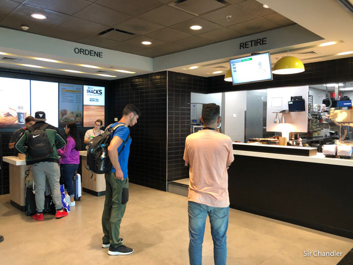 Quizas porque hay gente que vive lejos y le lleva varias horas de otro transporte antes de llegar alli, también pienso la mayoria que no tiene acceso a los vips y/o los que viajan con chicos… eso si, no subiria con hamburguesas a ningun avion, a lo sumo faltaria un Subway en esa zona…