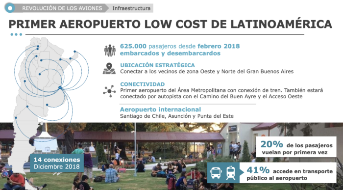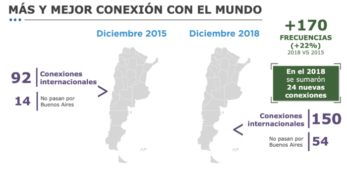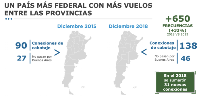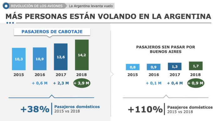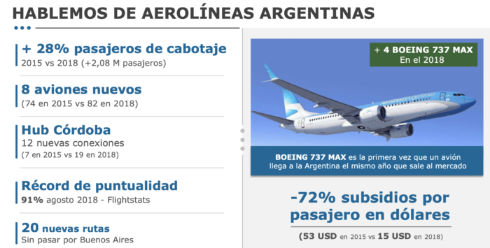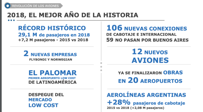 El primer cuadro mostrado habla del récord del año en cantidad de pasajeros. Las dos empresas nuevas (low cost), El palomar que arrancó a funcionar (parece que es hace un montón y Flybondi aun no tiene un año), 12 aviones más operando en el país, las obras de 20 aeropuertos, el crecimiento de Aerolíneas Argentinas y 106 nuevas conexiones