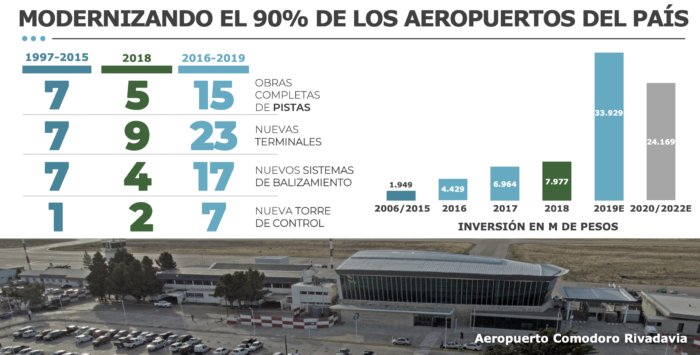 La lista de cosas que se hicieron y se están haciendo en aeropuertos. Explicando que el aumento de este 2019 en inversión es con los fondos generados por el cobro de las tasas, que obviamente aumentó por la cantidad y casos internacionales por la devaluación