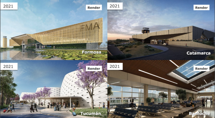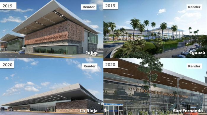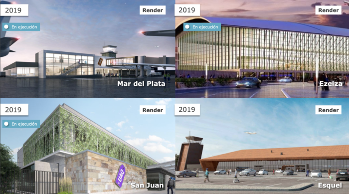 Y pego algunos renders que se vieron así al pasar con fechas… Mar del Plata dice para este año porque están trabajando, Ezeiza y la terminal de partidas lo mismo. San Juan en ejecución y Esquel dice render pero no se está trabajando aun.