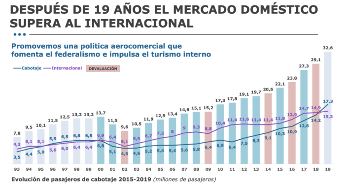 Otro punto interesante es lo de este cuadro que muestra la evolución de los pasajeros desde el año 93 y que sólo desde el 96 al 99 hubo más pasajeros de cabotaje que internacionales… cosa que se logró cambiar en 2018 y así debería seguir subiendo