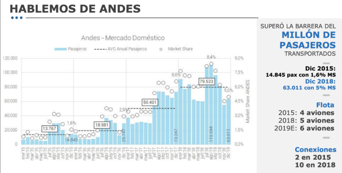 Y otra cosa que se habló mucho en estos últimos meses… ANDES. Ellos devolvieron cuatro Boeing 737-800 que trajeron no mucho tiempo atrás. Entonces lo que se dice es el retroceso de la empresa en un año, pero no se hace la comparación con lo que era unos años atrás. En 2015 volaban a dos lugares (Salta y Madryn) y ahora a 10 destinos.
