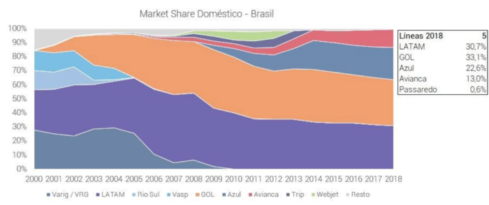 Y ver este gráfico del cambio de participación de distintas empresas en casi 20 años en Brasil también sirve para entender que siempre hay subes y bajas en las distintas empresas. Miren GOL que ahora es líder y en el 2000 no existía casi, donde Varig venía de baja hasta su desaparición en 2010.