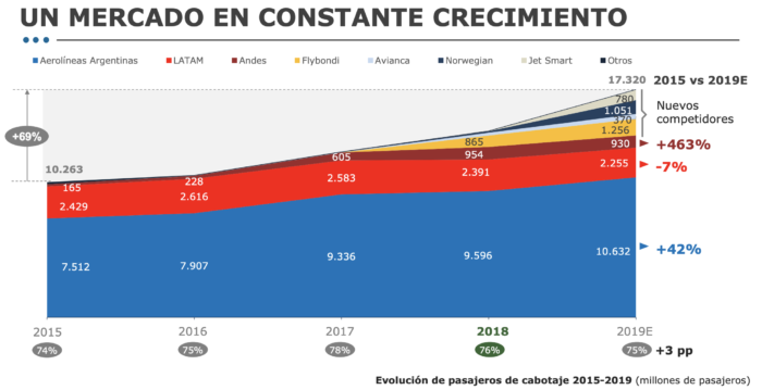 Este es un cuadro interesante porque muestra la suma de los pasajeros por aerolínea. Aerolíneas Argentinas creció un 42%, Andes un 463% (pese a su reciente achique) y la suma de Flybondi y Avianca, más el proyectado 2019 con Norwegian y Jetsmart