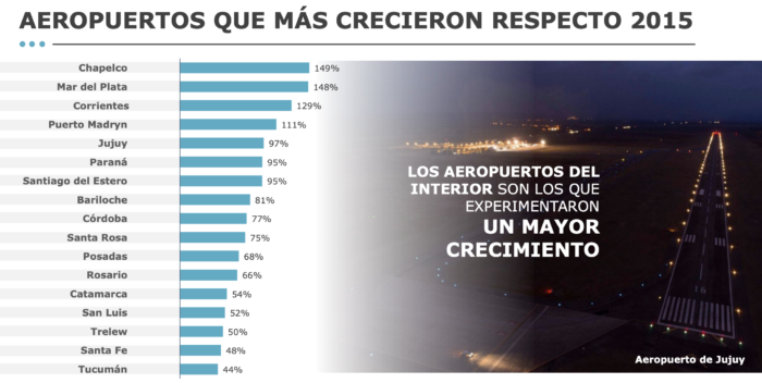 Ojo que es el % lo que se muestra, por eso hago la mención a Córdoba que con esa crecida tenés cientos de miles… un Chapelco tenía un vuelo diario que llegaba con suerte y ahora puede tener hasta tres por día en temporada, por eso el crecimiento es mucho más.