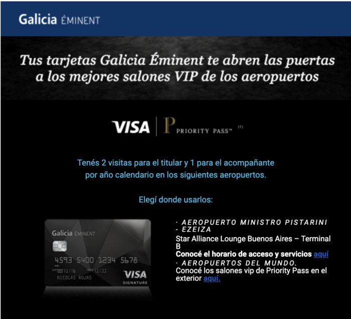 El Banco Galicia mandó mail a los clientes Eminent con una síntesis de los pasajes vip a los aeropuertos… lo cual es bueno porque nunca es del todo claro en ningún banco.