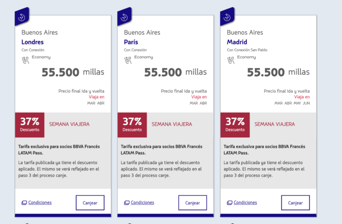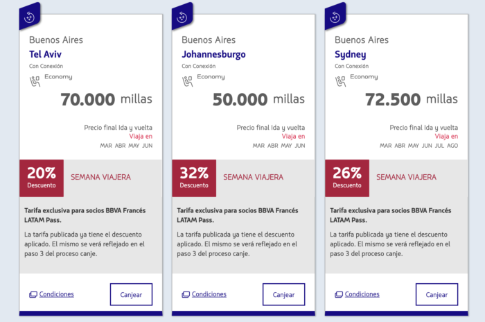 Promocion valida para canjear a Europa, Africa y Asia el 25/02/2019, Domestico Argentina el 26/02/2019, Brazil, Chile, Peru y Colombia el 27/02/2019, Norteamérica y Caribe el 28/02/2019.