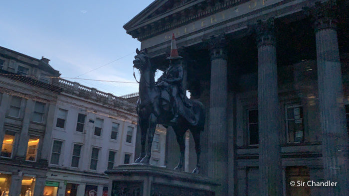 Y hasta una obra absurda «que demuestra el espíritu de los habitantes de Glasgow…» donde a Wellington hace muchos años le pusieron en una madrugada un cono de los de tránsito y desde entonces si alguno lo saca otro lo vuelve a poner! Acá hay una nota de El país que lo cuenta.