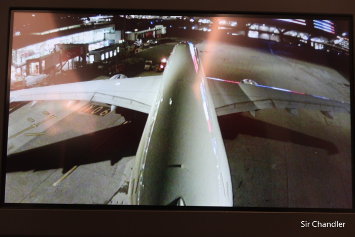 Entré, saludé a los cuatro pilotos, les pregunté por la cámara que estaban viendo en el tren de aterrizaje delantero y me mostraron como cambiaban esa visión por los indicadores clásicos. Pero ahí a la izquierda se ve el plano de la terminal y un tubo… que es el avión desde la cámara de la cola