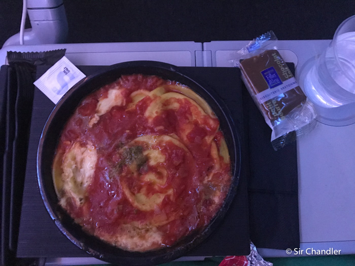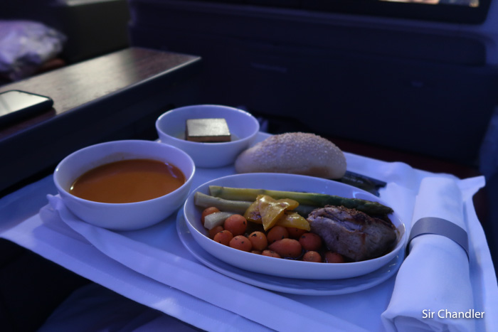 Nivelados me trajeron la cena que había pedido antes de despegar, de las tres opciones que había