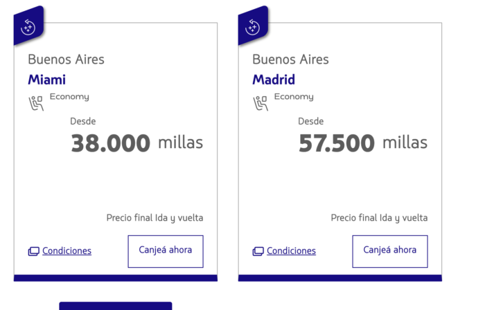 Además está en promoción el canje de millas para algunos destinos, y muestro el ejemplo de los dos que menciono en el título de Madrid y Miami… siendo la capital de España la de mayor descuento.