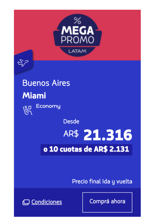 Acá el link de los pasajes promocionados en estos días y las cuotas https://www.latam.com/es_ar/promociones/mega-promo/?otid=893923&s_cid=onsite_AR_201902_home_vitrina_MEGAPROMO-FEB19