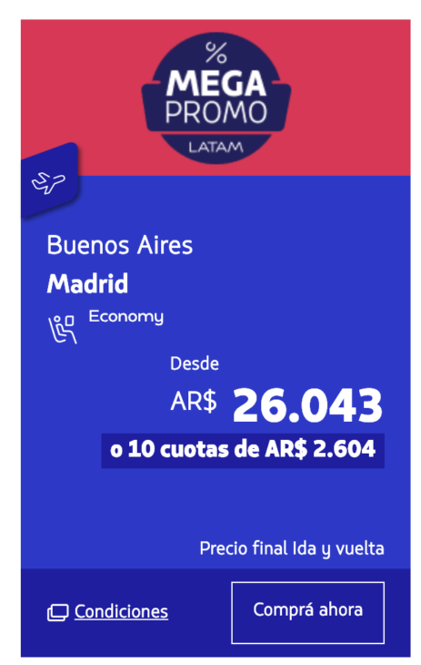 Acá el link de los pasajes promocionados en estos días y las cuotas https://www.latam.com/es_ar/promociones/mega-promo/?otid=893923&s_cid=onsite_AR_201902_home_vitrina_MEGAPROMO-FEB19