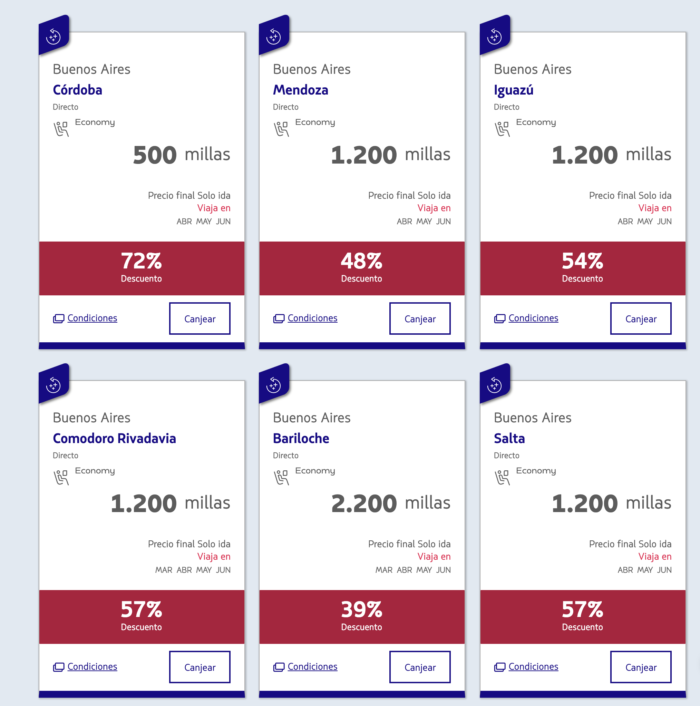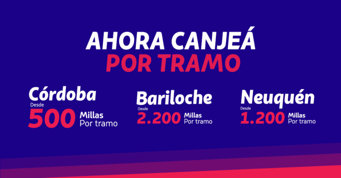 Hay canjes de 500 millas para Córdoba Buenos Aires, Mendoza, Iguazú y Salta 1.200 y Bariloche 2.200 entre otros