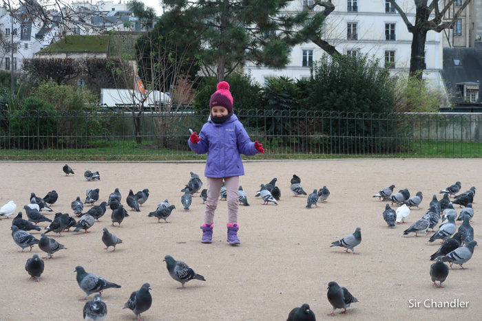 Sophie cortó una foto que estaba haciendo del frente para correr entre las palomas, todo en la plaza de enfrente