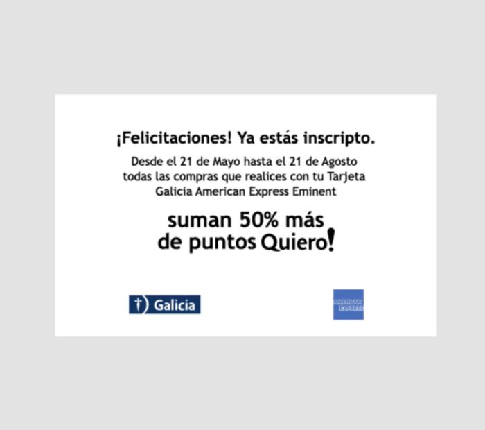 Hoy me llegó mail del Galicia con una promo para sumar un 50% más de puntos Quiero! entre el 21 de mayo y el 21 deagosto, si pagás con la American Express.