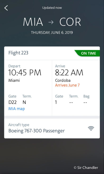 Pero arranco con algo del vuelo anterior, en la aplicación de American se puede ver el estado del vuelo siempre, porque uno se conecta a internet y esto es gratis. Entonces lo que quiero marcar para estos vuelos en conexión es ver a que puerta llego y de cual salgo