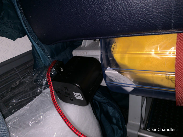 Además de toma USB debajo de los asientos de la primera fila o debajo de la pantalla como se ve en la foto de más arriba, tienen enchufe. Acá yo siempre pongo mi adaptador porque el USB así carga más rápido por ser 2.4. Y tengo cable largo 😉