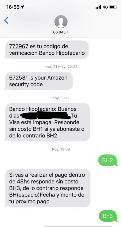 O sea llegó un SMS para avisar que no había pagado el resumen… y tenía razón!!! se me había pasado!!! entonces puse ese BH2… y ahí llegó el otro para ver si me hacía cargo en los próximos días… con el BH3.