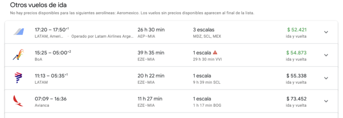 En este casi si aparecen mejores precios en vuelos con escala, pero claramente el primer lugar mostrado es un choclo de 36 horas con dos aerolíneas y 3 escalas. Absurdo. Luego el segundo es con Boliviana de aviación también con mucho tiempo de escala pero el tercero es Latam con escala en Santiago, aunque también con mucho tiempo