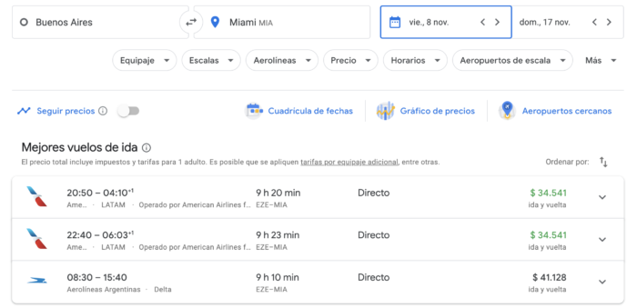 El otro ejemplo por la cantidad de vuelos que hay y por ser destino habitual, es Miami