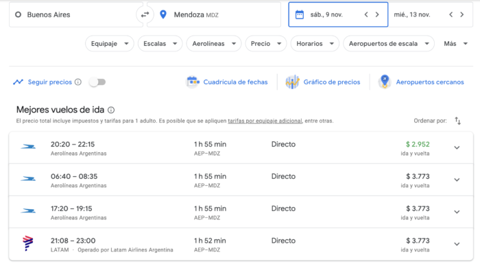 En noviembre se podría decir que están a USD 50 ida y vuelta… recordemos que son sin equipaje. Ese precio en una sola combinación. La siguiente de $3.773 se encuentra con más horarios y Latam también la tiene