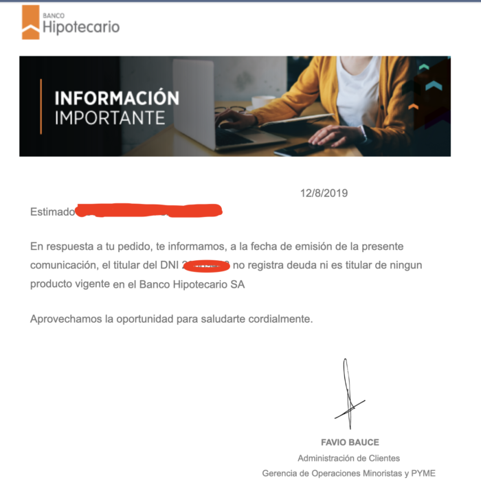 En ese llamado final que tuve un responsable de atención al cliente del banco se comprometió a que en agosto me mandaría la constancia de libre deuda con el banco. Y como varios me preguntaron en que había terminado todo no quise contar hasta tener eso en mi poder para asi si, dar por cerrado todo