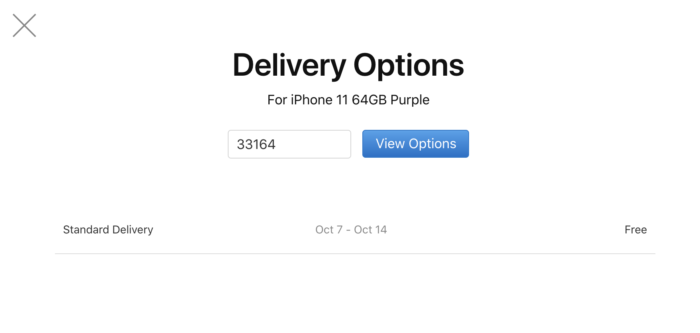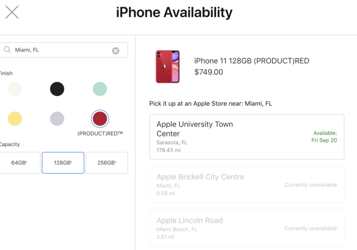 Si hoy se simula en la web de Apple la compra de un iPhone 11 PRO de 64gb da la opción de retirarlo en algunos apple store. Pero si pongo Miami el más cercano está a 160 kilómetros (Naples para ser precisos…) o el de Coconut
