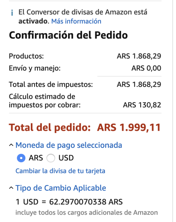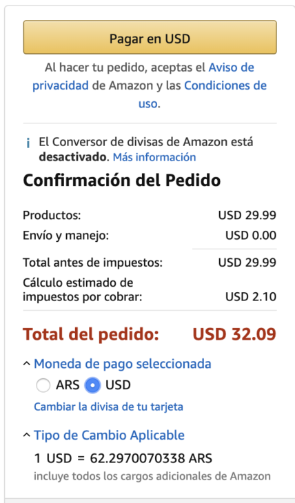 Al final se ve la conversión que aplica AMAZON que es de 62,29 pesos argentinos por cada dólar. Esto es algo que hay que verificarlo siempre, porque también pueden tener alguna demora… ya que según la web del nación está $62,50, o sea que puede haber incluso algunas horas donde sea conveniente…