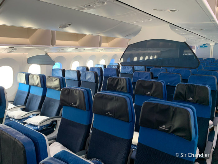 Esto que está primero es ECONOMY COMFORT y detrás de la «cortina» es economy normal. La diferencia son 10 centímetros de espacio para las piernas y un poco más de reclinación