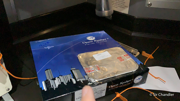 Muy cierto. De las mejores servicios Kosher saliendo desde ezeiza. Es open Kosher y parece que todos usan el mismo servicio. Generalmente arroz con carne. Pastron pepino y aceitunas de entrada.