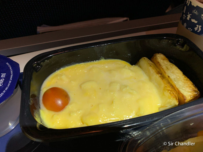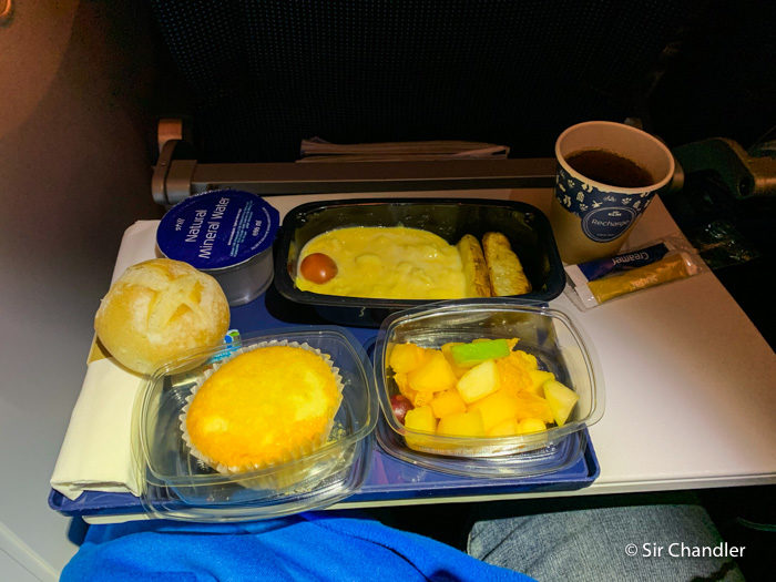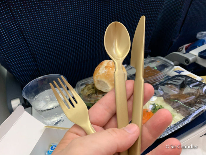 Cubiertos de plástico, pero duros. De fondo se ve el pancito y… EXCELENTE. Obvio eso se hace en Ezeiza por la misma empresa que lo hace para otros, pero me pregunto porque el resto no pide algo con esa calidad. Además lo entregaban calentito (Se repitió en el desayuno)