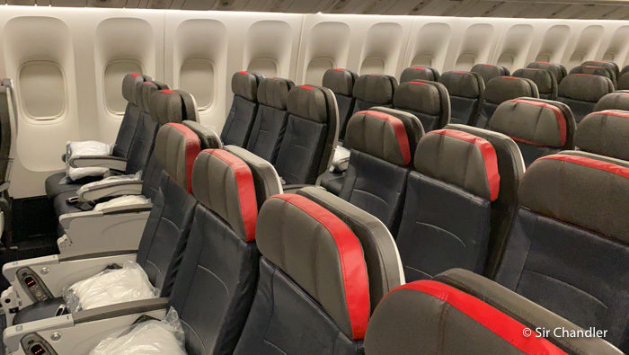 Y arranco entonces con mostrar esas cabinas. La turista, donde los asientos de «Main cabin extra» que básicamente en este avión tiene más espacio para piernas tiene toda la línea roja en el cabezal. Y la configuración es 3-4-3