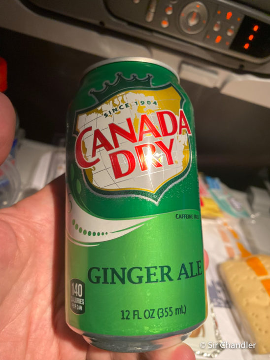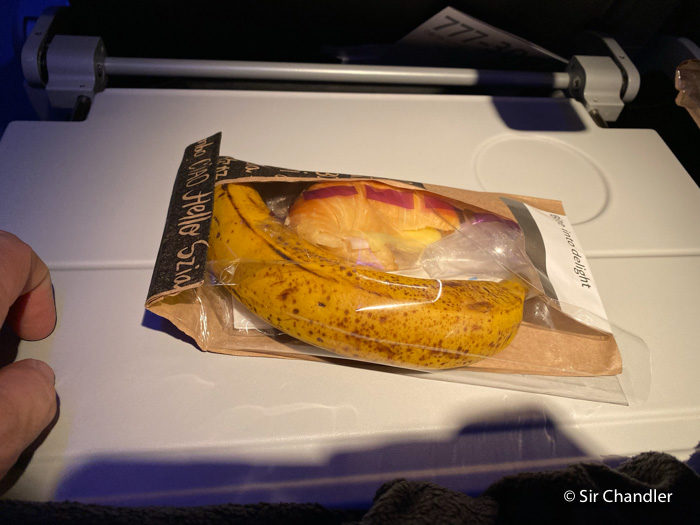 Al despertar tenía el desayuno… y recuerdo cuando hace unos años mostré una banana en el desayuno de Aerolíneas y leí quejas… luego vi en el de Delta, ahora en el de American. Banco la banana en el desayuno. También había una medialuna con jamón y queso, repartiendo té, café y jugos