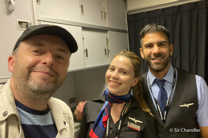 Y cuando terminaron el servicio y antes de ir a descansar, pude charlar y entrevistar a Pablo y Jessica, que fueron parte de la última camada que ingresó en American. Pablo trabajó muchos años en Latam (desde que era LAN) y Jessi en el Hyatt, pero fue su primera experiencia aérea. Divinos los dos y muy amables para la nota que verán dentro de la crónica de vuelo