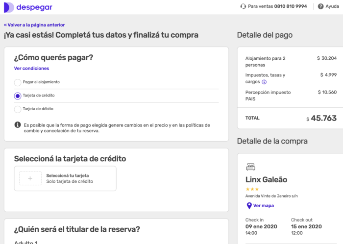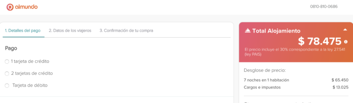 En Almundo tomé un hotel que no tenía la chance de pago en destino y desde el vamos está el «30% correspondiente a la ley….» o sea no dice ni percepción ni impuesto… más fácil 😉