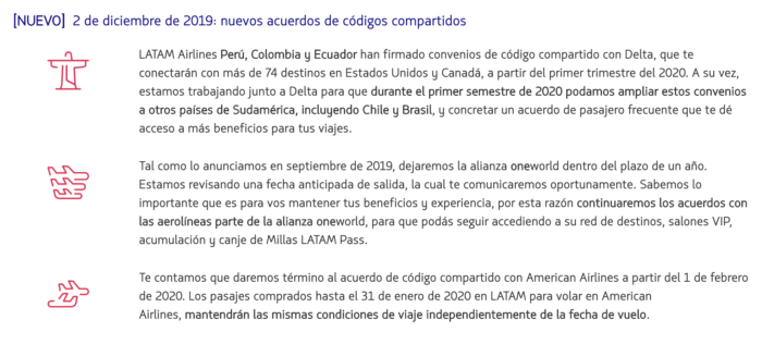 En este Episodio 3 vemos como se confirma que los códigos compartidos entre LATAM y American se dejarán de emitir en febrero próximo, es decir que no se venderán más pero que todo lo que se vendió antes de esa manera (latam vendiendo como propio un vuelo de American o al revés) se cumplirá obviamente.