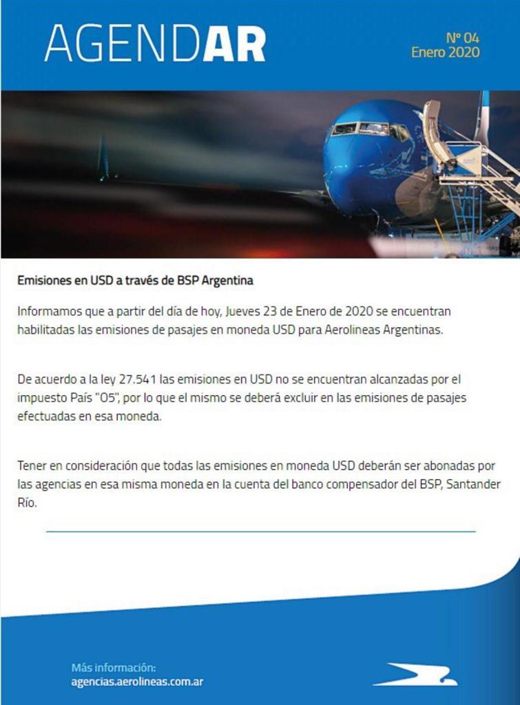 Aerolíneas Argentinas informó hoy a las agencias de viaje que ya se puede emitir en USD los pasajes, para que los mismos sean abonados por transferencia en esa moneda. De esta manera al no haber compra de divisas se evita el pago del 30% por parte del pasajero.